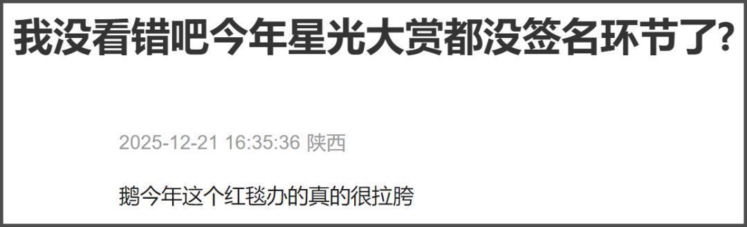 不少观众都反映今年的星光大赏各个细节上都不如往年,取消签名环节,背景板也只有一块,场地还小。