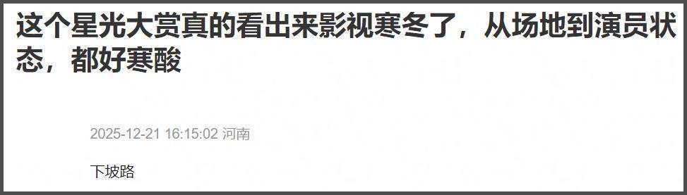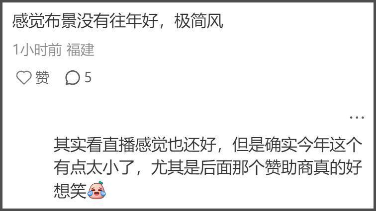 本来星光就黯淡,场地布景和明星穿搭也没有很亮眼,网友辣评“爆改村口大舞台”。