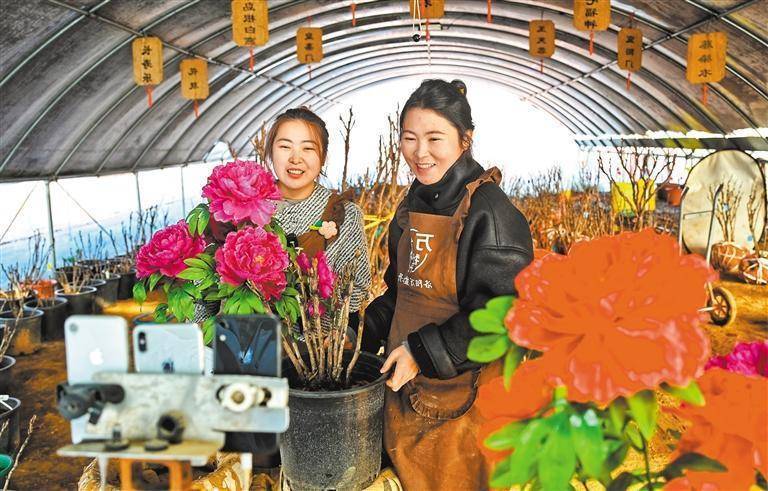 12月15日,河南省洛阳市土桥社区温室大棚,花农通过网络平台直播销售催花牡丹。
