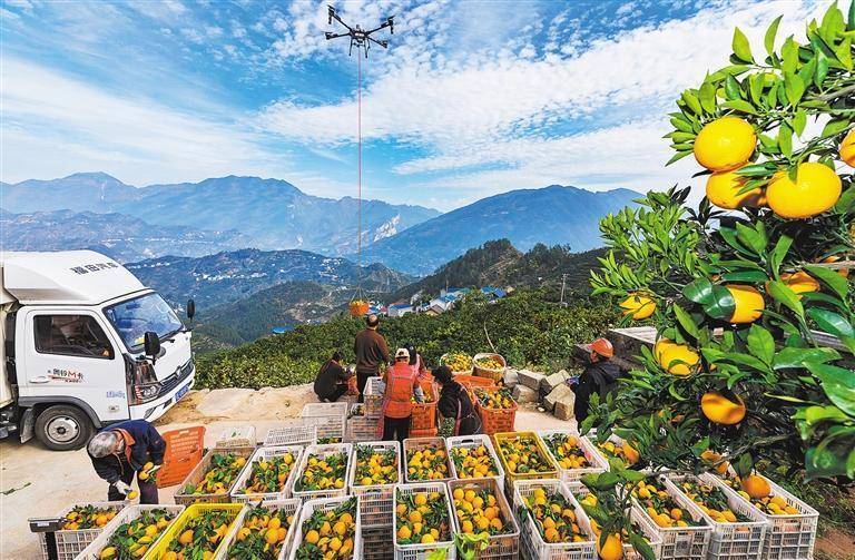 11月26日,湖北省宜昌市秭归县郭家坝镇邓家坡村,无人机飞手操作无人机吊运鲜橙。该县推动“电商+供应链+农户”发展模式,拓宽脐橙销售路径。