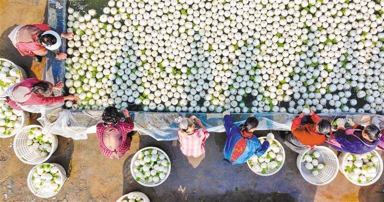 11月24日拍摄的重庆市垫江县新民镇七桥村蔬菜园,村民在清洗白萝卜。该蔬菜园结合大棚控温、滴灌、无土培育和智能监管等技术,日均可供应新鲜蔬菜达5000斤。